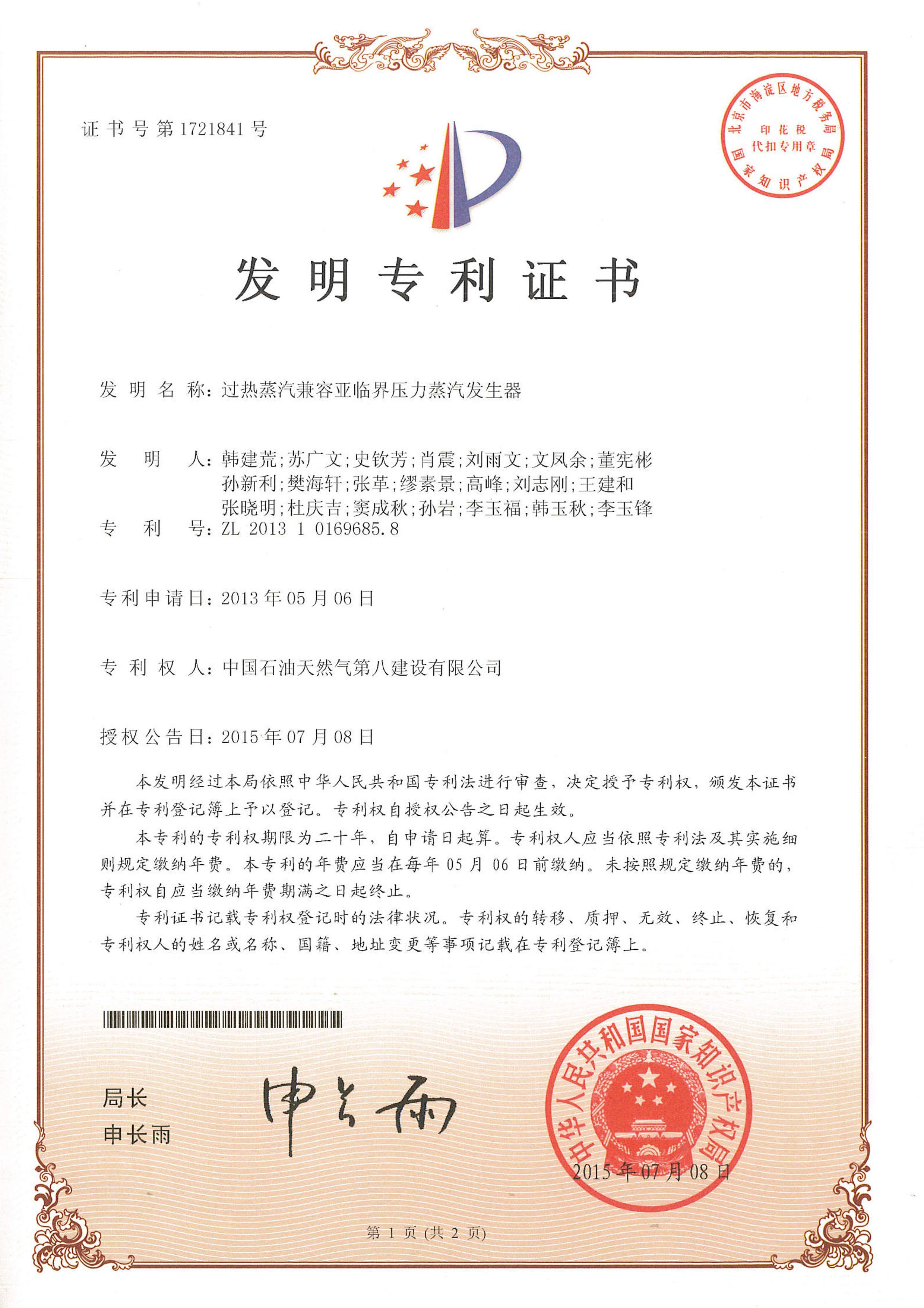 过热蒸汽兼容亚临界压力蒸汽发生器发明专利证书