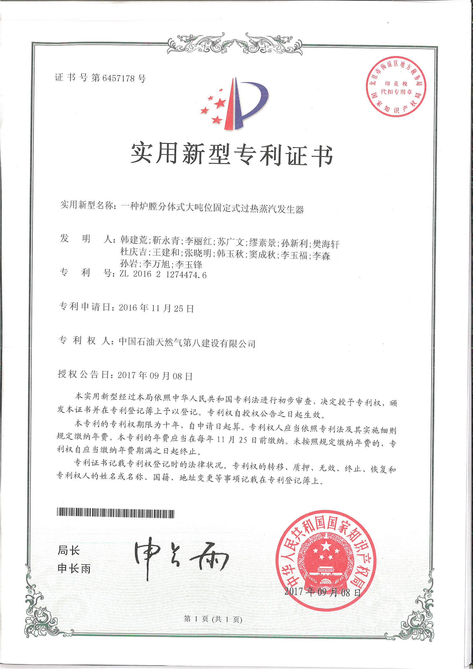 一种炉膛分体式大吨位固定式过热蒸汽发生器实用新型专利证书